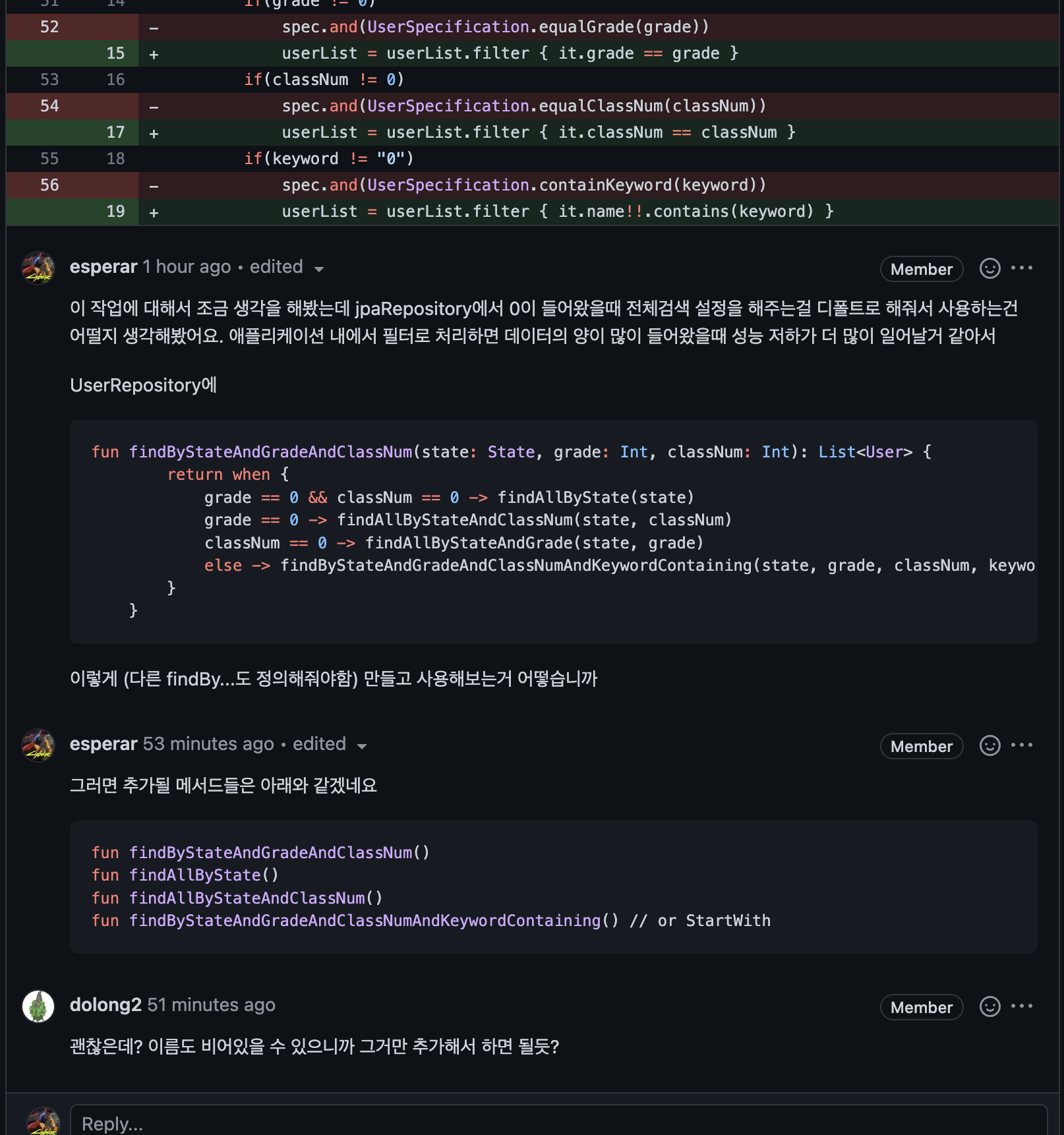 교내 프로젝트중 교내 계정 통합 소셜 로그인 서비스 GAuth를 개발하는 중에 가입된 유저를 검색하는 api가 있다 학년 반 키워드를 입력받아 검색 기능을 처리했고 만약 0을 입력받으면 전부 검색한다는 요구사항이 있었다. 그리고 그걸 내가 개발한게 아니고 팀원이 개발을 해서 pull request를 보내고 코드리뷰를 하는 과정에서 궁금증이 생겼다.