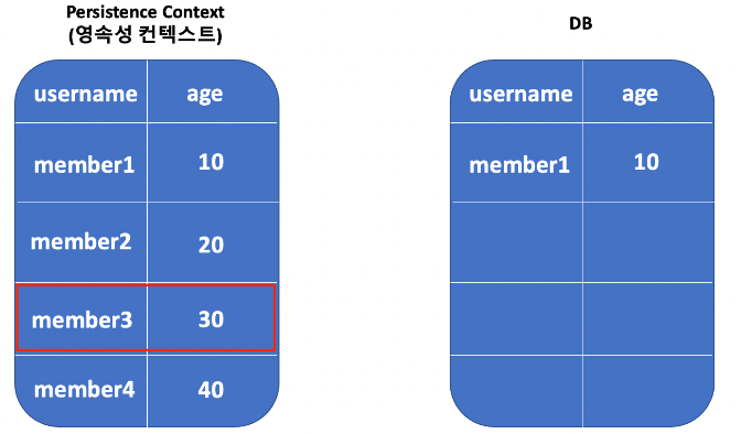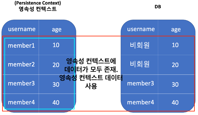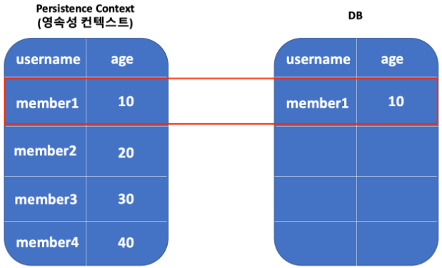 이 때 member1에 해당하는 엔티티가 영속성 컨텍스트에 존재하므로 실제 DB의 데이터 대신 영속성 컨텍스트에 존재하는 데이터를 사용하게 된다.