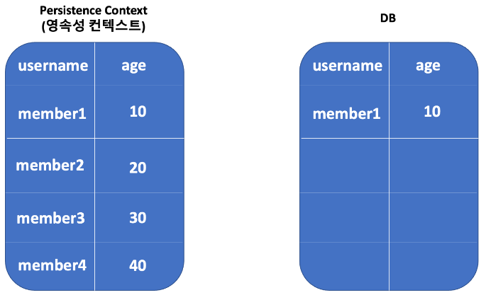 member2, member3, member4는 실제 DB에 존재하지 않기 때문에 영속성 컨텍스트를 확인할 때 조회 대상에 포함되지 않게 된다. 따라서 selectFrom을 한 최종 결과는 member1만 반환하게 된다.