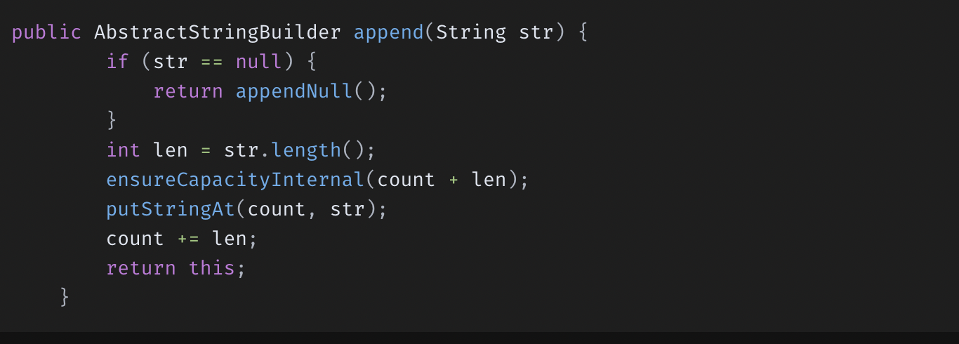 AbstractStringBuilder안에 append라는 메서드가 구현되어있는데 내부 구조는 이렇게 되어있다.