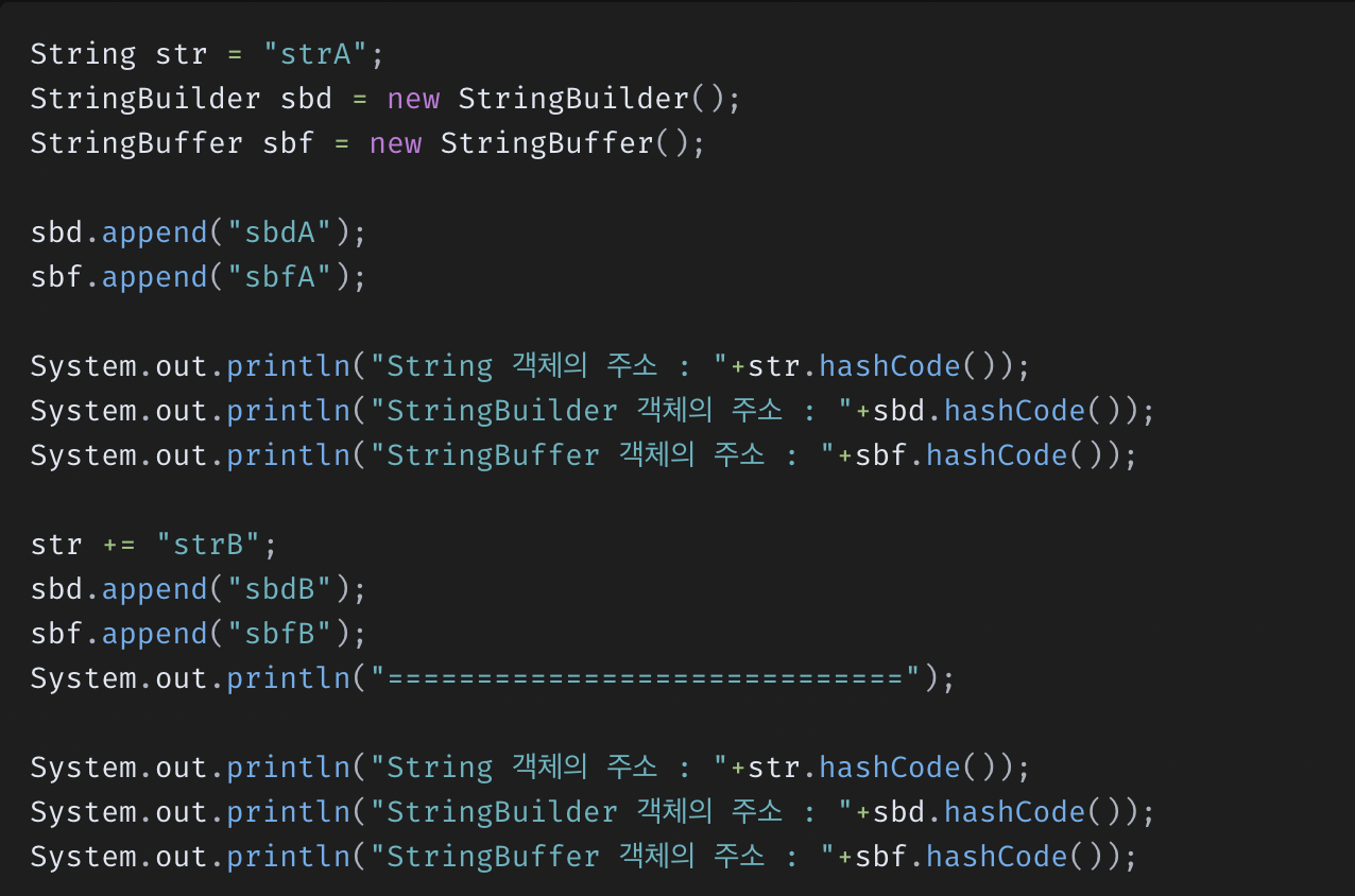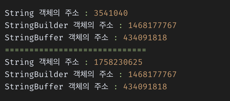 값을 바꾸고 hashCode로 주소값을 출력했을때 String 객체에 주소만 변환이 되어서 출력이 된다.